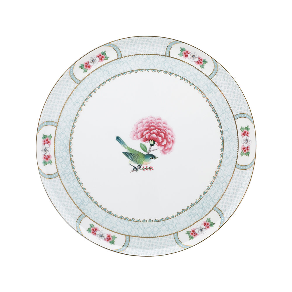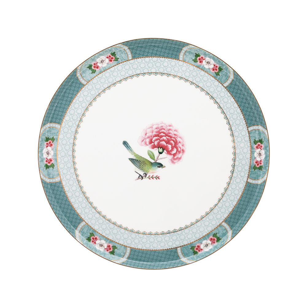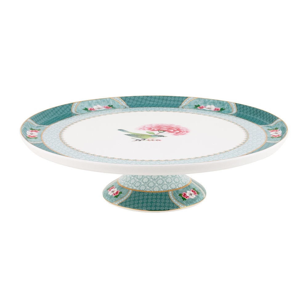 ستاند كيك دائري من تشكيلة بلاشنق الزرقاء ، مزين بتفاصيل رقيقة، أزهار موسمية، ولمسات ذهبية.