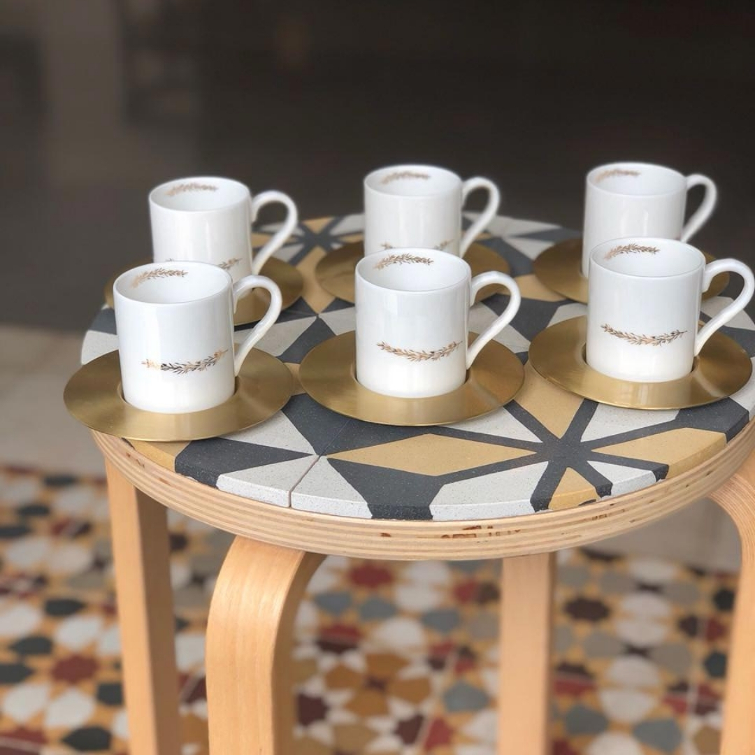 مجموعة من 6 أكواب اسبريسو مع صحون نحاسية في علبة.