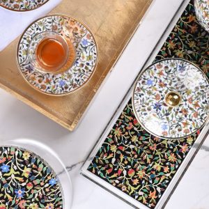 These sleek glass istikanahas sit atop porcelain saucers, adorned with an elaborate display of intertwiningfloral vines in vivid shades of sapphire blue, ruby red and emerald green. Whimsical and refined, the set will add a touch of charm to any occasion.