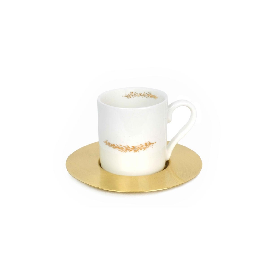 Set of 6 Olive Branch espresso cups with gold brass saucers in a box.